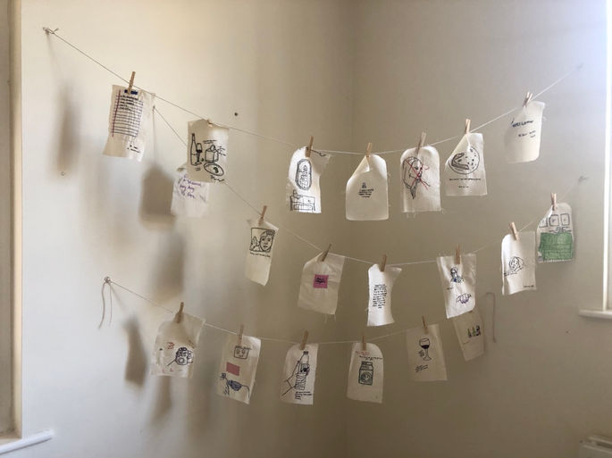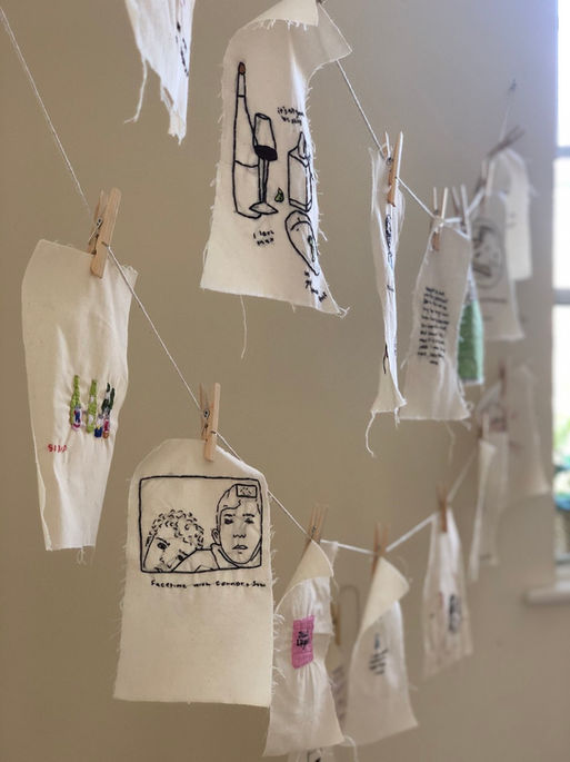 "Airing Out My Dirty Laundry" pulls from selected pages from my sketchbooks spanning from 2017-2020. Each piece is a hand-embroidered replication of an individual page from my collection. With a lot of time alone during this pandemic, I think many of us began fixating on the past. What had been, and what was lost. This series serves as an indulgence of that fixation: by painstakingly embroidering drawings from my past sketchbooks onto fraying pieces of cloth, I obsessively worked to replicate memorials to my past life. Sharing my sketchbooks, often feels like airing out one's dirty laundry, revealing, intriguing, and often times embarrassing. However, by removing the surrounding context of these sketchbook pages, the viewer only gets pieces of vulnerability, an experience not unlike to someone watching their neighbor hangup their clothes.